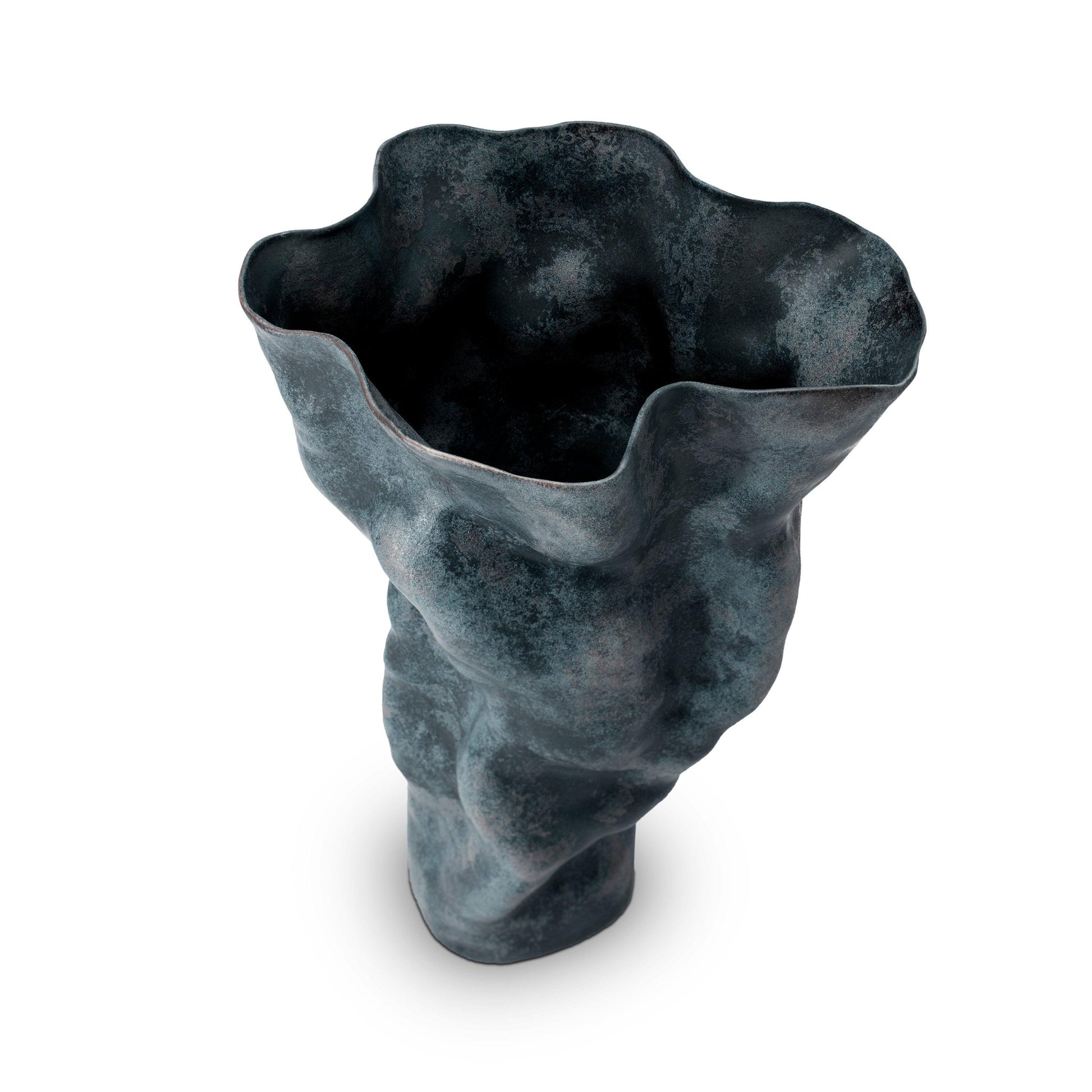 Porcelain vessels with an ancient feel, inspired by the mineral tones of the earth around the biblical copper mines in the Arava desert of Israel, known as King Solomon's Mines. This commanding 22" tall vase is sculpted and glazed by hand, each piece has intriguing character.