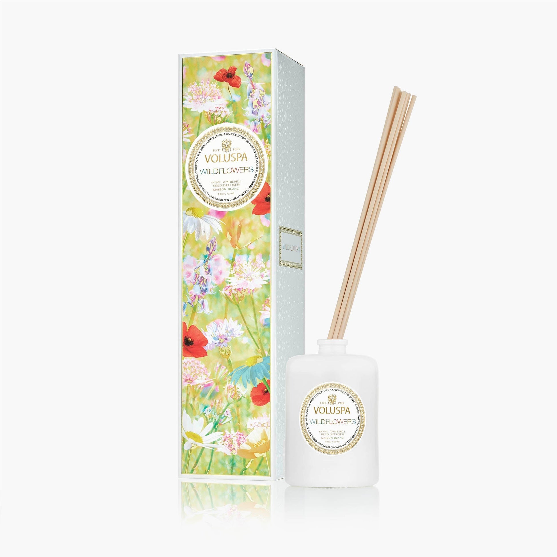 Youve been called to dance among the wildflowers, losing yourself in the beauty of this unruly floral sea. Lightly pass your hand over a kaleidoscope of Native Wildflowers, blooming Golden Poppy, Ambrosia and springing Herbs; sugared by misty vapors of Blue Agave and delicately kissed by the rising Citron sun. Gently coax this fragrant super bloom of Voluspas Wildflowers.