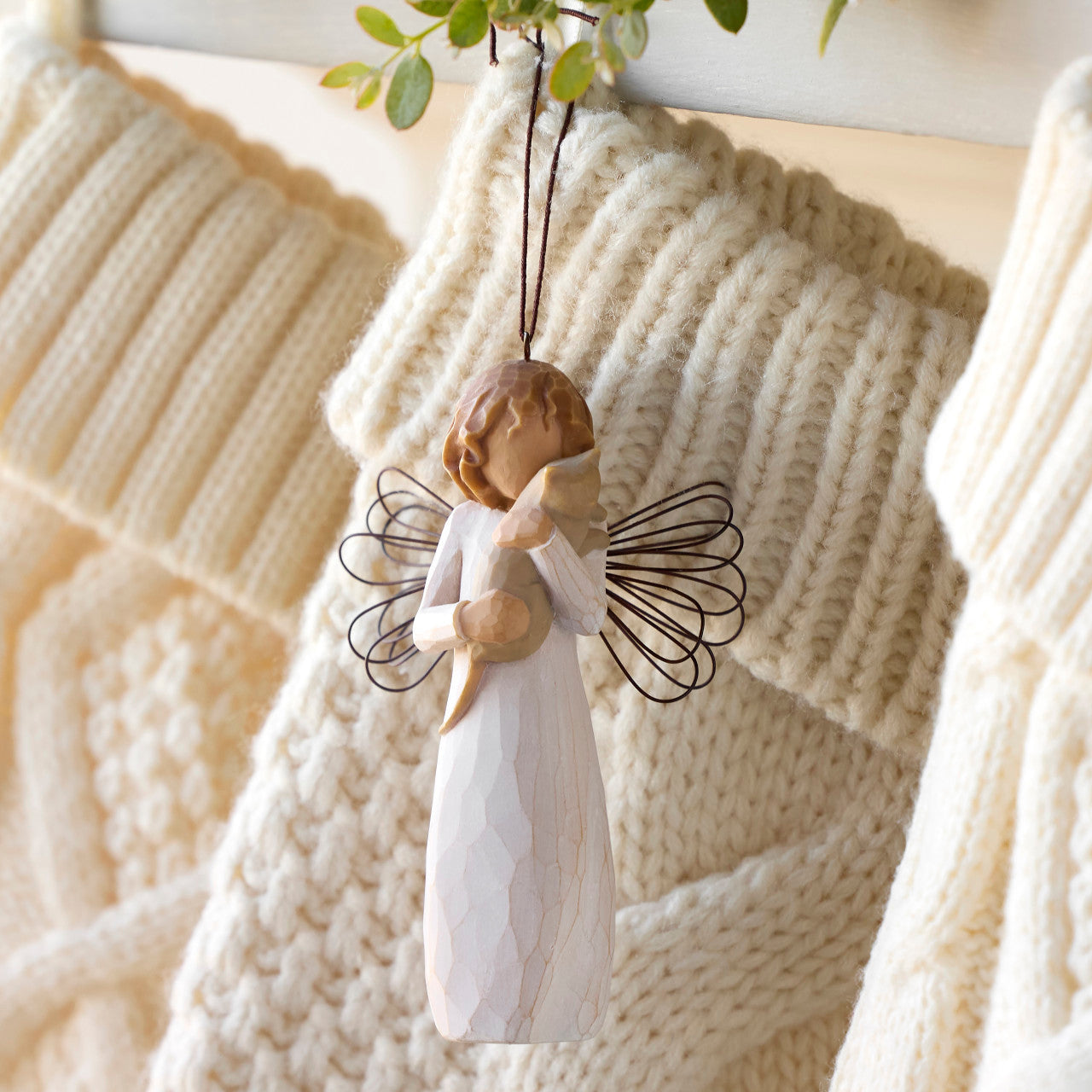 - Angel in cream dress with wire wings, holding gray cat in arms. Hook and loop affixed to figure's head