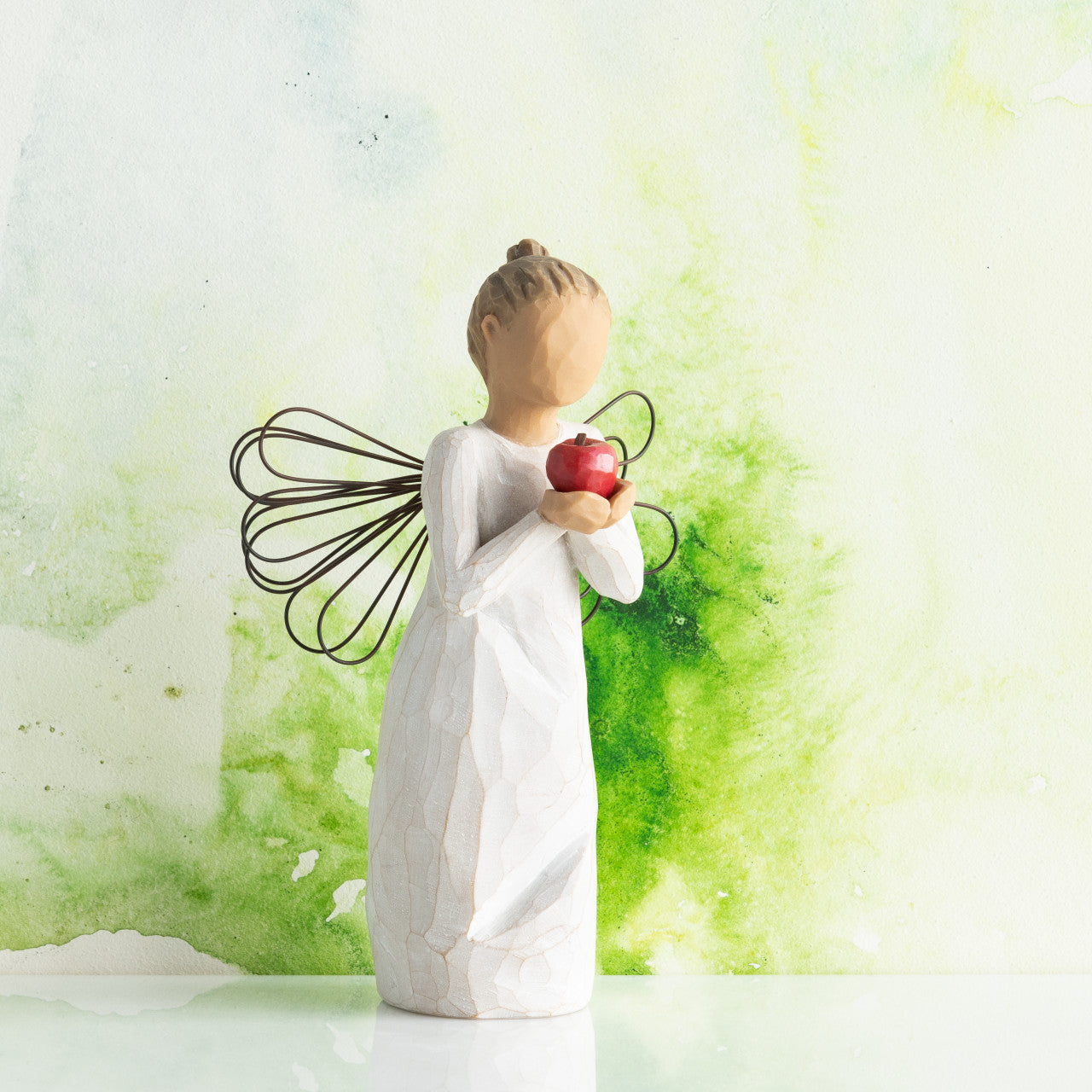 - Standing angel in cream dress with wire wings, holding large, shiny red apple in outstretched hands